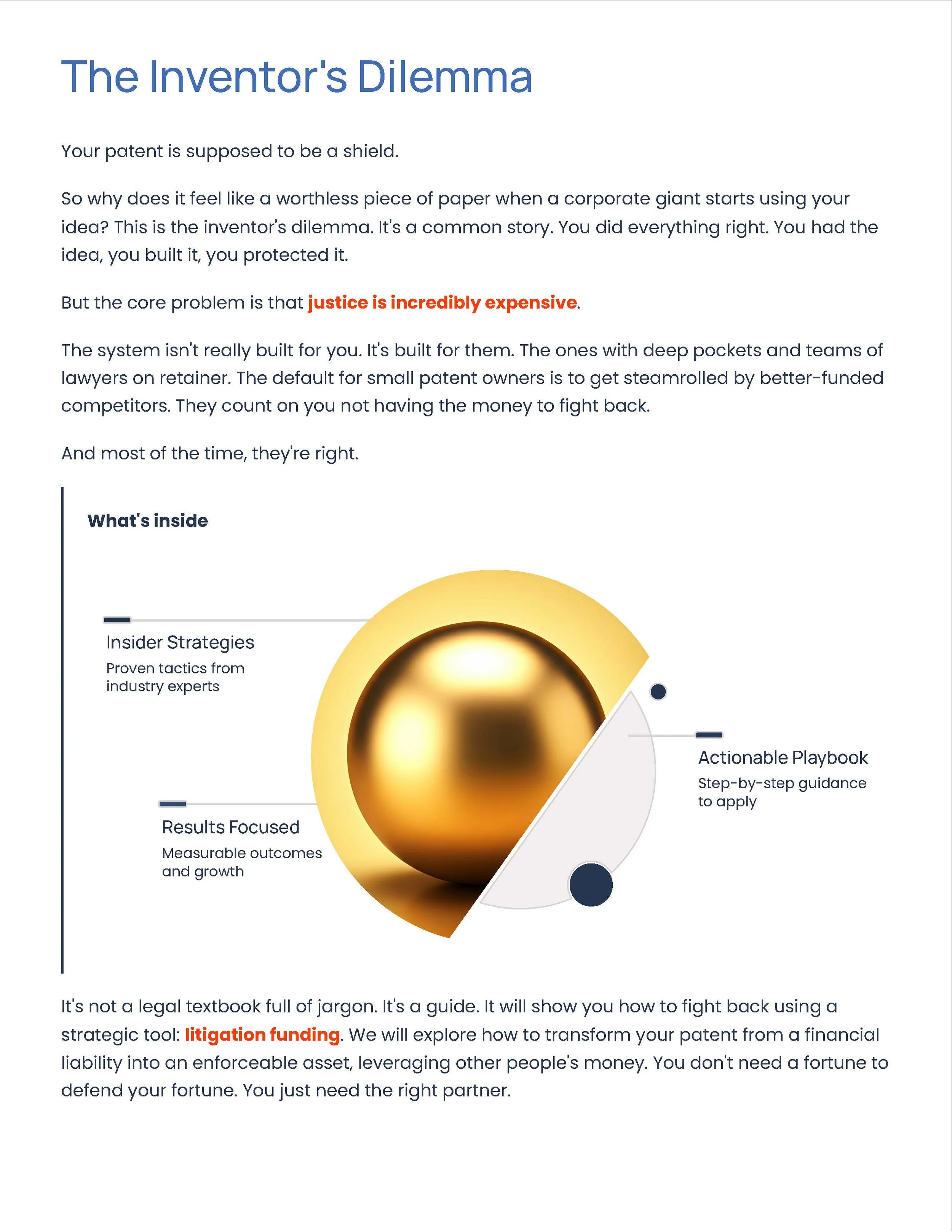 Don't let them. Litigation funding is the equalizer. This guide is your playbook to fight back, enforce your patent, and claim the value you created. Turn your invention into the asset it was always meant to be.